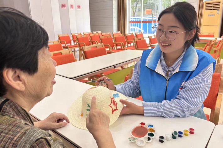活动的重头戏来了,制作心仪的礼帽。志愿团成员们早已精心准备了手工草帽制作的颜料和工具。老人们根据自己的喜好和创意,挑选颜料、设计图案,和志愿团成员们一起动手制作属于自己的独特草帽。他们或低头专注地勾画,或互相交流心得,现场氛围温馨而和谐。